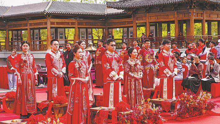 4月27日,一场别开生面的集体婚礼在雄安悦容公园举办,25对新人身着中式传统礼服,在“未来之城”共许爱的承诺、共倡婚俗文明新风。