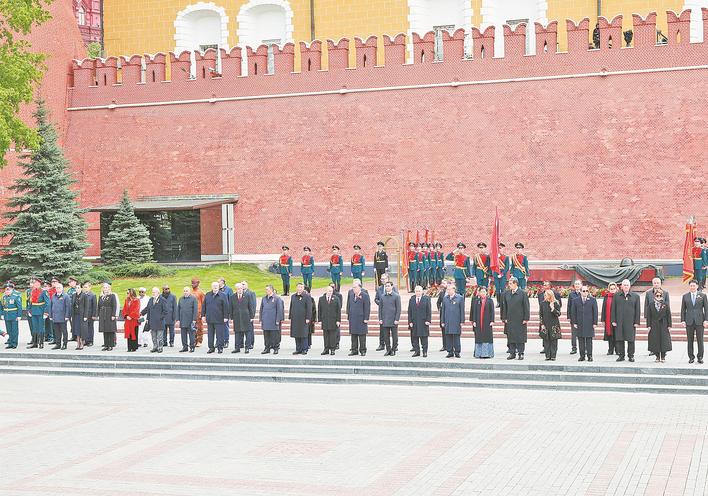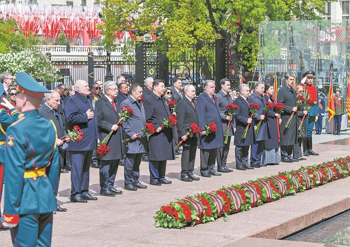 当地时间5月9日,俄罗斯举行盛大庆典,纪念苏联伟大卫国战争胜利80周年。国家主席习近平和来自世界20多个国家及国际组织领导人应邀出席庆典。庆典结束后,习近平同其他国家领导人一起从红场来到亚历山大花园,向无名烈士墓献花,并肃立默哀。新华社记者 翟健岚 摄