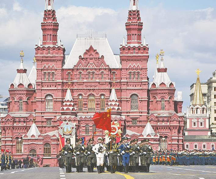 5月9日,在俄罗斯首都莫斯科,中国人民解放军三军仪仗队方队参加纪念苏联伟大卫国战争胜利80周年阅兵式。 新华社记者 赖向东 摄
