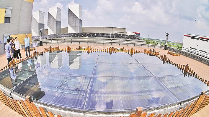 大兴国际机场临空经济区大兴片区内楼顶“绿电工厂”安装的碲化镉发电玻璃屋顶。新华社发
