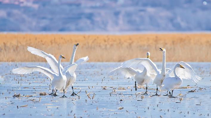 怀来县官厅水库迎来美丽的天鹅。孙一民 摄