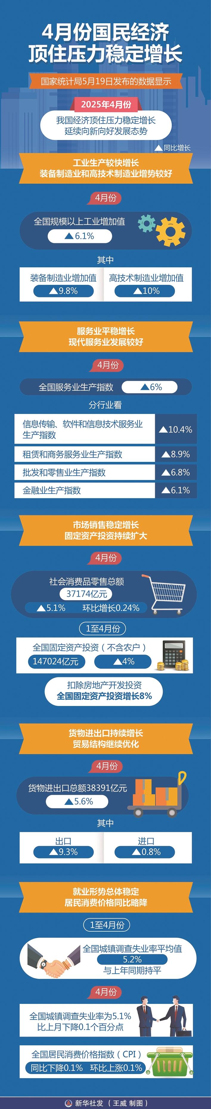 4月份,尽管国际环境更趋复杂严峻,外部冲击影响加大,但我国经济顶住压力稳定增长,延续向新向好态势。