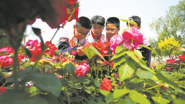 初夏时节,平乡县第三小学的月季花正值盛花期。走进校园,只见淡粉、嫣红、明黄等颜色的月季花争奇斗艳,花瓣层层叠叠,花朵错落有致,吸引同学们前来赏花。刘杨 范钦龙 摄