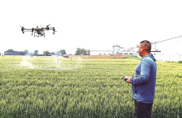 在大城县留各庄镇南曹村小麦种植基地,农民利用植保无人机实施飞防作业。刘雅娜 摄
