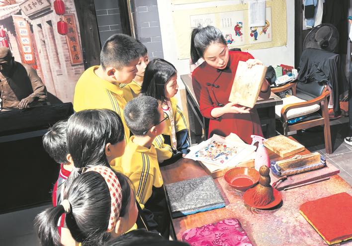 讲解员为学生介绍年画木版。杜聪惠 摄