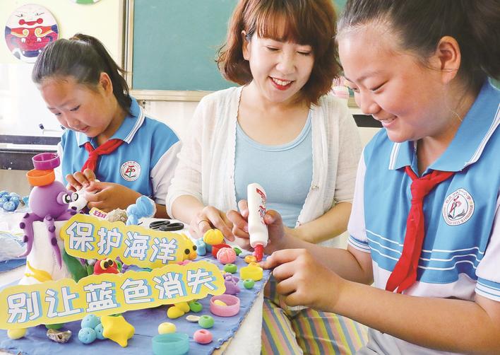 6月8日,海港区杜庄学区第一小学开展“保护海洋 从我做起”活动。该校教师带领学生使用废旧材料制作保护海洋环境主题的美术作品,旨在增强学生保护环境、爱护海洋的意识。曹建雄 摄