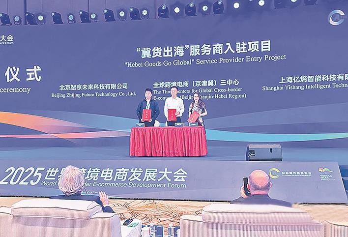 在2025世界跨境电商发展大会上,全球跨境电商(京津冀)三中心、北京智京未来科技有限公司、上海亿熵智能科技有限公司签约“冀货出海”服务商入驻项目。