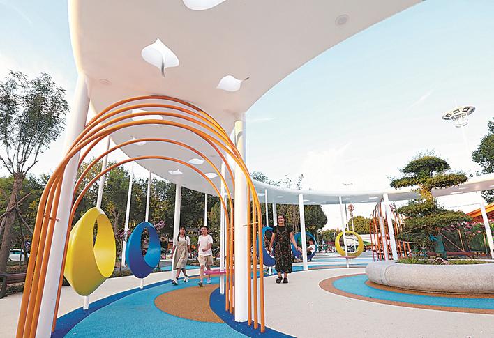 8月9日,小朋友在晋州市朝阳公寓公园玩耍。2025年以来,晋州市对城区15个街角和社区公园小景实施改造提升,着力打造生态、活力、共享的现代城市公园,助力城市绿色发展,为城市公共空间注入新活力,增进市民幸福感和获得感。新华社记者 杨世尧 摄