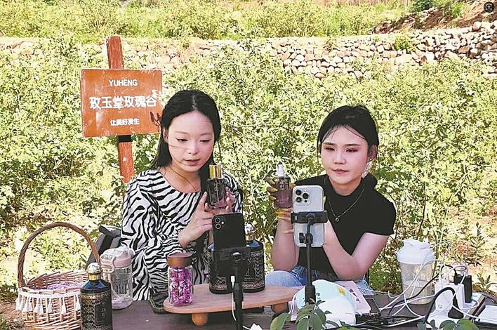 武安市主播在矿山镇淮河沟的玫瑰种植基地介绍大马士革玫瑰系列产品。 江芳延 摄