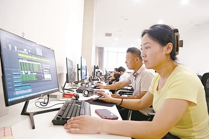 在馆陶县“一品一播”直播基地AI直播区,工作人员在剪辑音频。 郭江鹏 摄