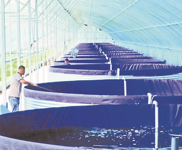 鱼在菜间长,菜在水中生,在“鱼菜共生”大棚里,20个直径6米、高1.45米的圆柱形金属养鱼缸整齐排列,缸里的鱼儿甩尾跳跃,活力十足,而旁边菜池里的生菜、空心菜、芹菜根系全部浸在清水中。这里一个鱼池可投3000尾鱼苗,园区10座大棚200个鱼池可年产鲈鱼、鳜鱼等70多万斤,主要销往京津冀地区,市场供不应求。