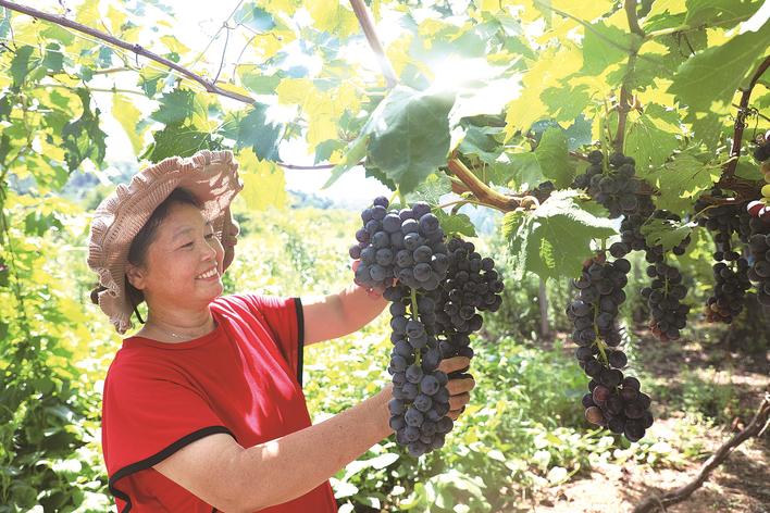 近日,丰润区火石营镇潘家峪村的葡萄陆续成熟,村民忙着采收葡萄供应市场。潘家峪村四面环山,昼夜温差大,气候、水土等自然条件十分适合葡萄生长,全村种植葡萄1300多亩,有“燕山脚下吐鲁番”之称。图为潘家峪村村民采摘葡萄准备运往市场销售。
