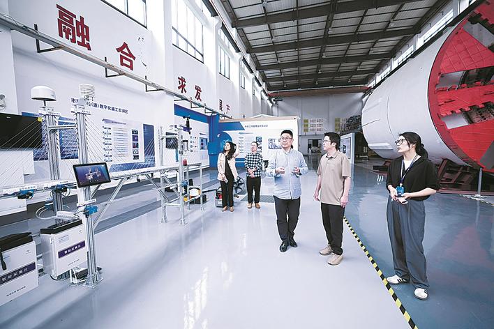 4月17日,在杭州科技职业技术学院实训基地,富阳经济技术开发区助企服务专员(右一)、企业代表(右二)、学校代表(右三)在进行政企校产学研合作交流。新华社记者 徐昱 摄