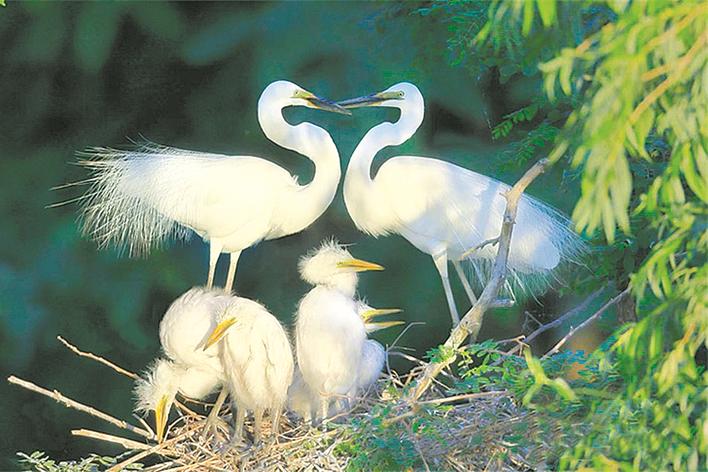 曹妃甸湿地的大白鹭亲鸟和即将会飞的大白鹭雏鸟。曹大庆 摄