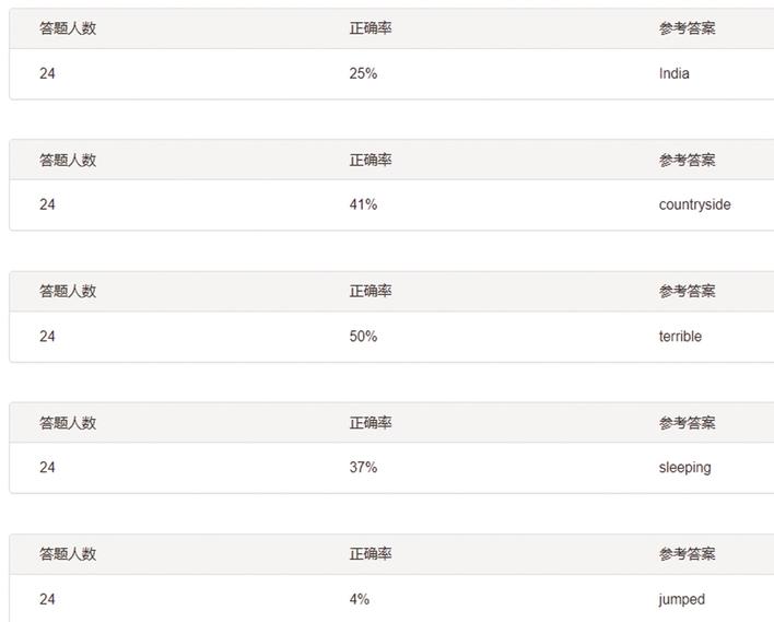 通过“爱老师听说端”后台数据,可以发现从参与答题的24位同学中,只28%的学生对where did the girl go last weekend?能正确作答。这是一个特殊疑问句,从选项来看,有2种可能,问题和选项没看懂,或者没听清,听了之后不知道如何作答。