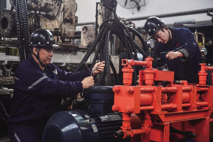 开滦集团唐山矿业公司坚持从小处、细处着手抓机电设备的管理,有效消除设备潜在的安全隐患,为矿井的安全生产奠定了坚实基础。图为该公司员工在对钻机进行维护保养。 庞英德 崔弈 摄