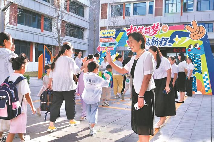 石家庄高新区封龙大街小学迎来了“开学有梦 成长有光”秋季开学典礼。老师们早早来到校门口,面带微笑,热情地迎接每一位学生的到来。 石家庄高新区文教局供图