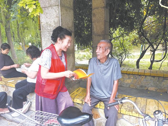 银龄志愿者韩秀萍在景县灵秀园公园为高龄老人科普安全知识。吴月 摄