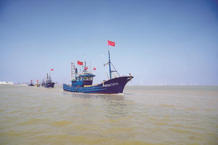 在沧州渤海新区黄骅市南排河中心渔港内,渔船有序出港进行捕鱼作业。