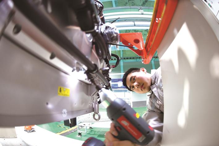 在唐山锐唯新能源科技有限公司,工作人员在调试氢能燃料电池发动机。梁玉水 摄
