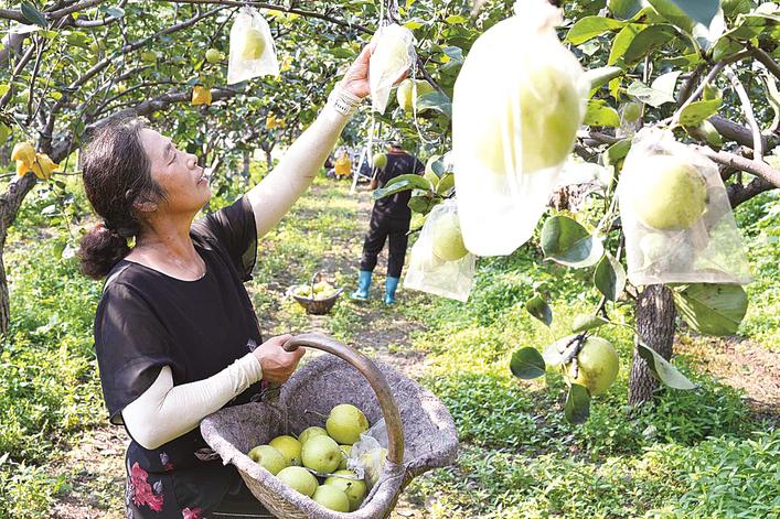 农户采摘鲜梨。