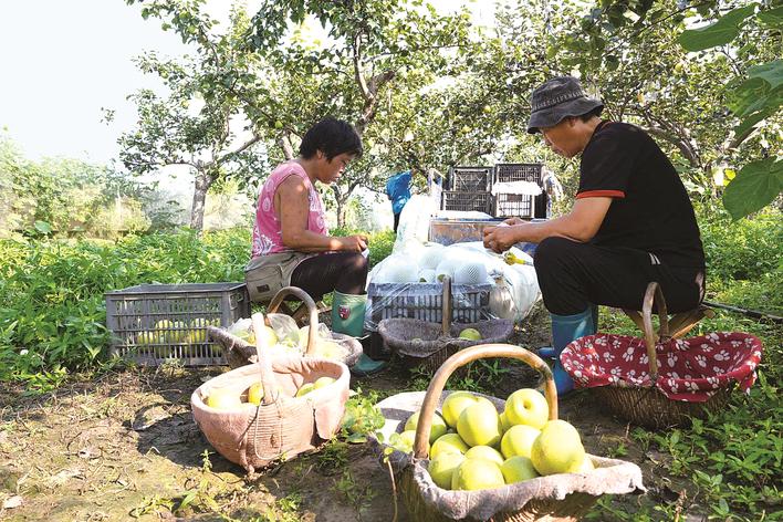 农户将梨装箱。