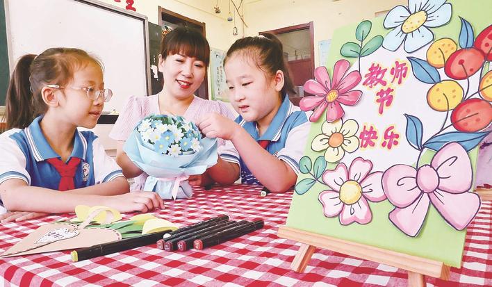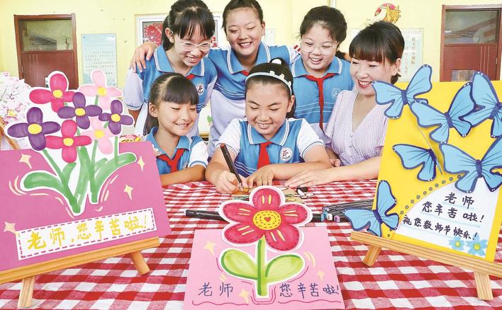 近日,秦皇岛市海港区杜庄学区第一小学开展“大手拉小手 迎接教师节”活动。该校美术教师带领学生绘制贺卡、制作工艺品,并将做好的礼物送给教师,向老师们表达深深的感激之情和节日祝福。曹建雄 摄