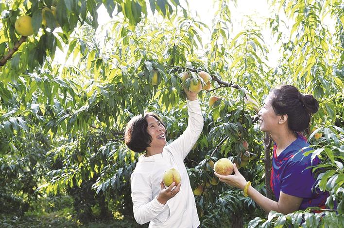 游客采摘寒露蜜大桃。王晖 摄