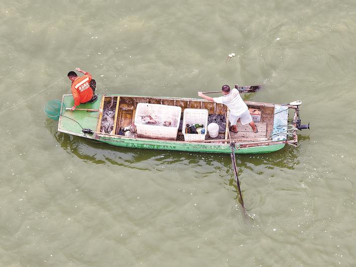 清晨,渔民早早下湖捕鱼。张凯 摄