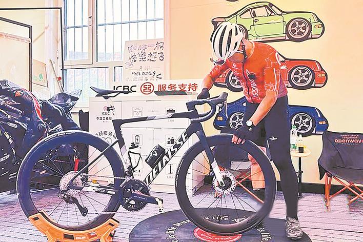骑行爱好者在工行邢台分行自行车服务驿站检修车辆。 吴梓桐 摄