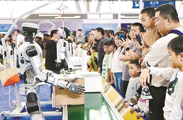 9月20日,在2025世界制造业大会智能机器人展区,一款人形机器人为观众演示搬运物品。