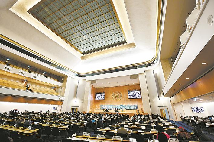 这是9月18日在瑞士日内瓦万国宫拍摄的联合国人权理事会第60届会议现场。 中国常驻联合国日内瓦办事处和瑞士其他国际组织代表陈旭18日出席联合国人权理事会第60届会议并发言,反对有关国家干扰主权国家间正常司法合作,以人权为借口干涉别国内政,呼吁切实促进和保护所有人权。新华社记者 连漪 摄