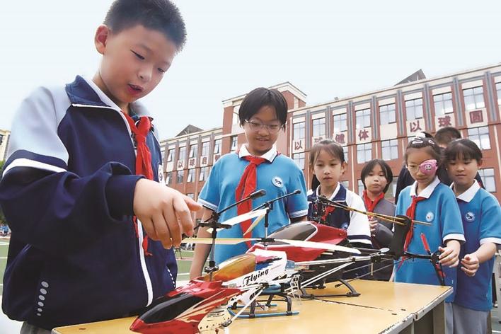 9月17日,石家庄市栾城区兴安大街小学学生在观看无人机。近日,“心怀梦想 逐梦蓝天”——栾城区2025年全国科普月主场活动“航空航天科普进校园”在石家庄市栾城区兴安大街小学举办。活动通过科普讲解和互动体验,为学生普及航空航天知识,激发青少年科学兴趣与探索精神。李明发 摄