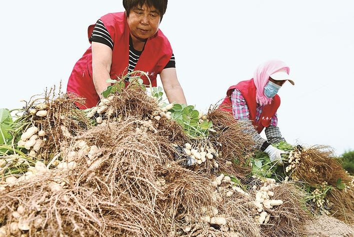 近日,怀来县大黄庄镇民丰合作社的农田里,农户们正忙碌地收获花生和红薯,一派繁忙景象。近年来,大黄庄镇充分发挥沙质土壤透水、透气性好的自然优势,以“一村一品”为发展路径,积极调整农业产业结构,依托“专业合作社+基地+农户”模式,规模化发展花生、红薯等特色经济作物种植,带动农民增收,助力乡村振兴。图为村民在收获花生。孙慧军 摄