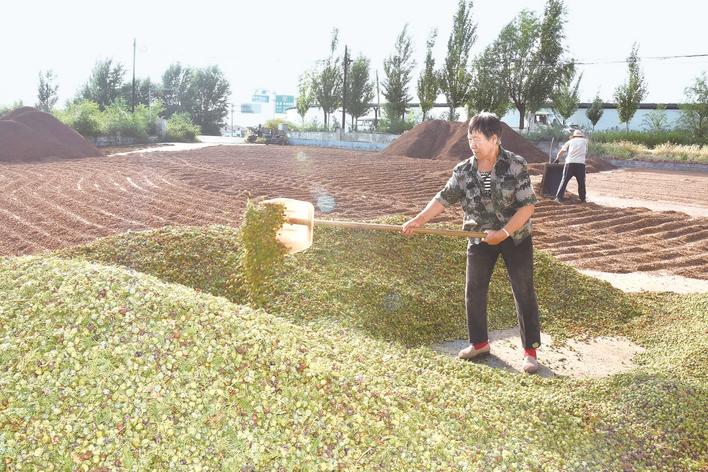 下花园区辛庄子乡松柏果、酸枣等野生资源丰富,近年来,该乡响水铺村杜春卫开辟了稳定的销售渠道,每年收购松柏果、酸枣数百吨,助力农户增收。图为农户在农产品收购点晾晒松柏果。 尹辉 胡倩倩 摄