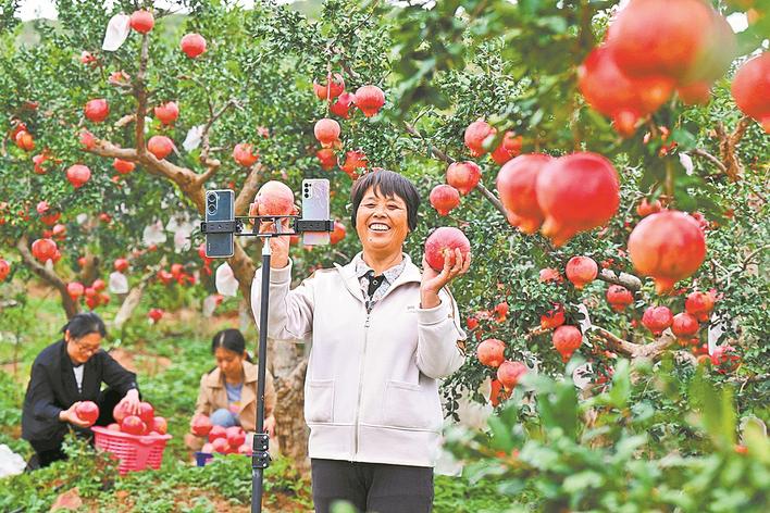 九月二十二日,在石家庄市元氏县北正乡北正村,农民在石榴园直播带货。金秋时节,各地农民在田间地头忙碌,脸上洋溢着丰收的喜悦。 新华社发(陈其保摄)