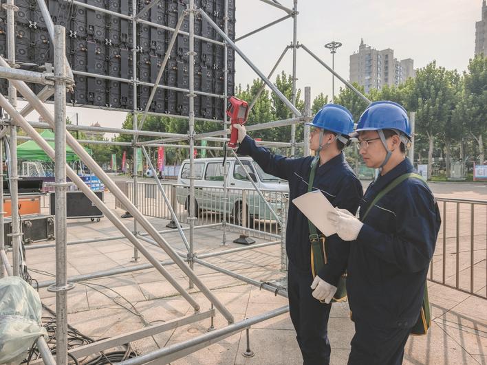 为保障三河市2025“同飞杯”五人制足球超级联赛期间电力安全稳定供应,国网三河市供电公司提前部署,对三河市文化中心广场供电设备及新投入的音响、照明系统开展全方位检查,确保大功率设备运行稳定。图为该公司运维人员在赛场检查用电设备。 王占武 摄