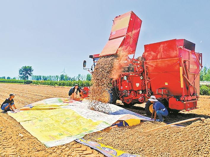 田间地头,机械轰鸣。花生翻地机轻松拔起植株,整齐铺放;摘果机连秧带果“吞”入脱粒,金黄饱满的花生纷纷落下。农户们忙碌地翻晒果实,汗水与笑容交织,小花生真正变成致富的“金豆子”,托起村民稳稳的幸福。