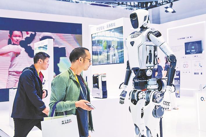 “背上‘时空算力背包’,人形机器人可以自主规划路线,精准感知户外位置。”千寻位置网络有限公司展示的人形机器人格外吸睛。现场工作人员介绍,“时空算力背包”融合AI等前沿技术,相当于给机器人配备了负责感知、推理和行动的“小脑”,将加速机器人从专用场景走向复杂空间。