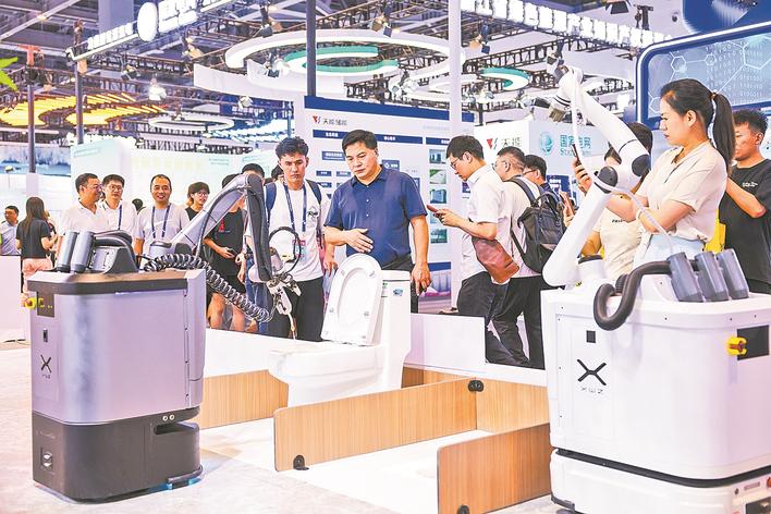 9月25日,观众在人工智能展区观看一款自清洁机器人工作。9月25日至29日,第四届全球数字贸易博览会在浙江杭州举办。本届数贸会以“在数贸会看见创新未来”为年度主题,展览总面积15.5万平方米,参展商数量超过1800家。新华社记者 江汉 摄