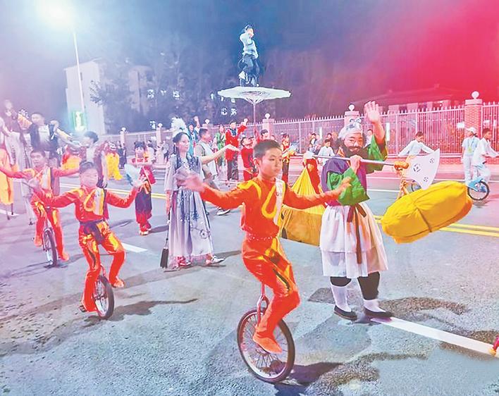 杂技巡游队伍中,小演员在骑独轮车,远处的演员在表演伞上骑车。本报记者 吴新光 摄