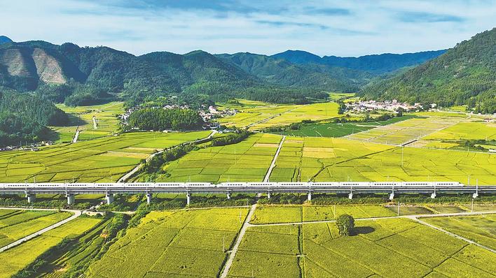 9月29日,动车组列车疾驰在向莆铁路福建三明段(无人机照片)。新华社发