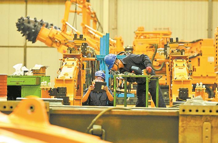 10月9日,在石家庄装备制造产业园,技术人员在石家庄煤矿机械有限公司装配车间组装装备。