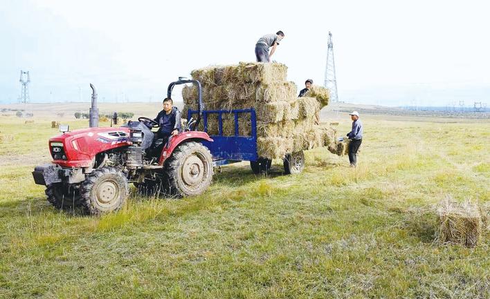 金秋时节,察北管理区迎来了一年一度的打草旺季。养殖户驾驶着割草、搂草、捆草等机器,在草原上穿梭作业,成片牧草被快速收割、搂集、晾晒、打捆、装车。图为养殖户在收割牧草。辛海成 摄