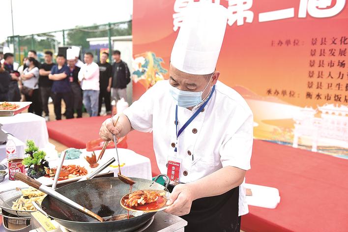 近日,景县第二届名厨争霸赛成功举办,全县各大餐饮企业技术骨干与顶尖名厨同台竞技,角逐“厨王”称号。评委从专业烹饪、口味质感、作品呈现等维度综合评审,最终高级厨师马志良摘得“厨王”桂冠。图为参赛选手在专心烹饪菜品。 高雷 摄