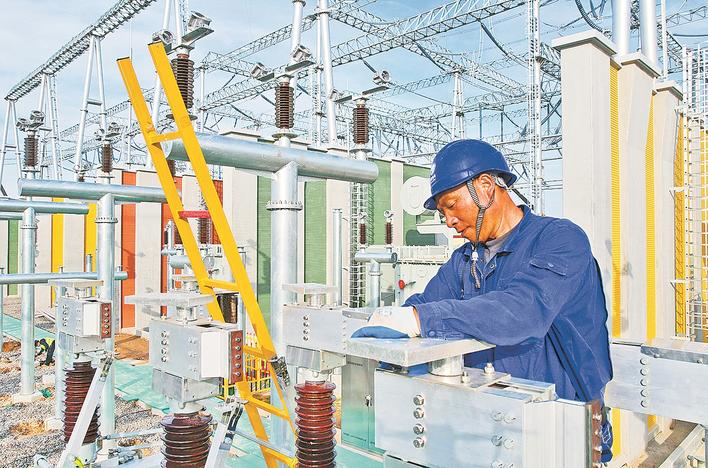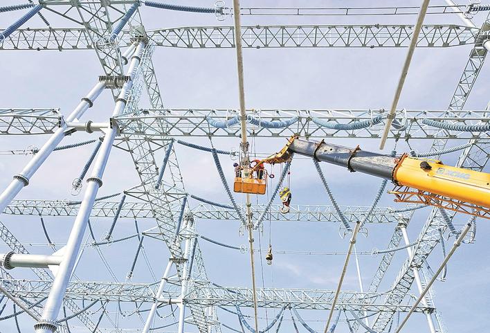 10月14日,工人在宁晋县境内的国网邢台北500千伏超高压变电站建设工地施工。