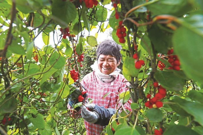 近年来,玉田县在稳定粮食种植面积的基础上,鼓励引导农民调整种植结构,采取订单种植模式,发展中药材种植。目前,全县中药材种植面积6800余亩,产值5300余万元,成为当地农民增收致富的重要途径。图为玉田县亮甲店镇孔五官屯村中药材种植基地,农民在采摘五味子。姚文海 摄