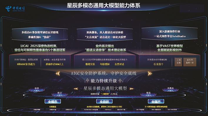 中国电信坚持自主研发与技术引领,打造出全国产、全自研、全模态的“星辰”多模态通用大模型,并持续推动其能力演进与人才体系协同发展。近年来,在多个AI前沿应用领域取得突破性进展,成果居于行业领先地位。