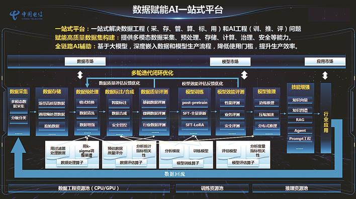 中国电信深入推进“云改数转智惠”战略,围绕算力、数据、模型、平台与应用进行全链条布局,构建覆盖“采、存、算、管—标、训、推、评—用”全流程的AI数据能力体系。由此,中国电信将海量原始数据高效转化为标准化、可复用、高质量的数据资产,为模型训练与AI应用提供坚实可靠的数据基座,全面激发智能时代的数据要素价值。