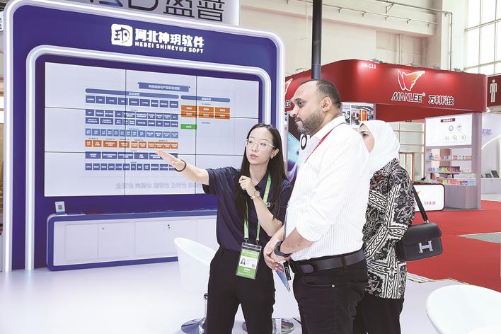 大型“国展”现场,外国嘉宾对神玥软件数字组织管理工具“贝贝管理”产生浓厚兴趣。洪波 摄